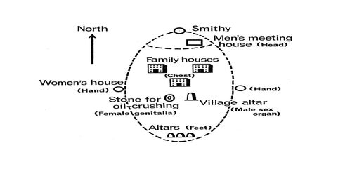 When viewed in its entirety, the arch's structural reciprocity suggests a “cosmic egg,” symbolizing the earth as a fertilized zygote. The analogy continues when considering ancient African settlement patterns where the village assumes the image of a person in the shape of a egg––The Village in the Image of the Universal Person.